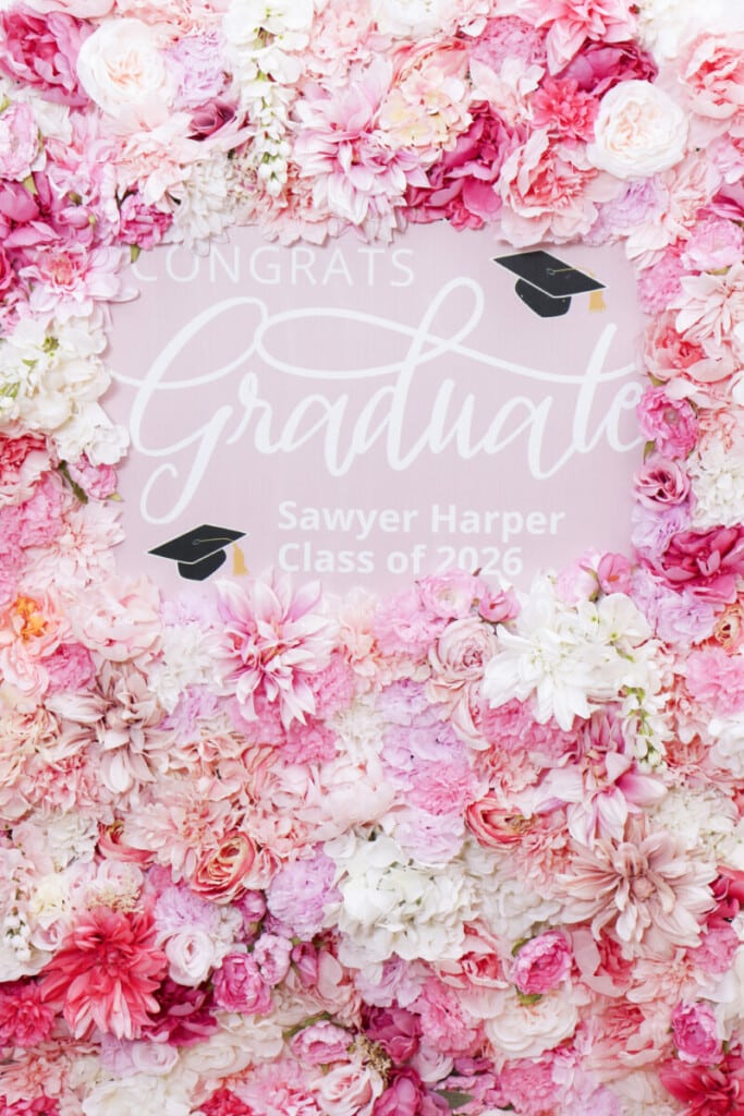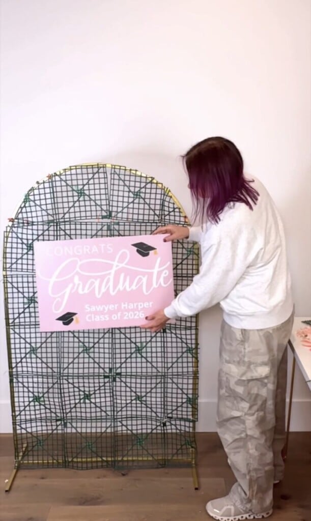 Where can I buy the supplies? Everything is linked in the supply list above and in my LTK shop. The arch frame and grid panels are on Amazon, the faux florals are from Michaels and Amazon, and the graduation sign is from Oriental Trading.
