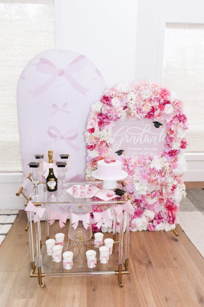 For Sawyer’s graduation party the arch was the centrepiece of the whole setup, providing the backdrop to the perfect cake cutting and “cheers” moment — pink and black throughout, with a candy bar, a memory box craft table, and personalised details that made the whole set-up feel intentional and elevated. Every single guest commented on it, and the photos in front of it are ones her mom is going to keep forever.