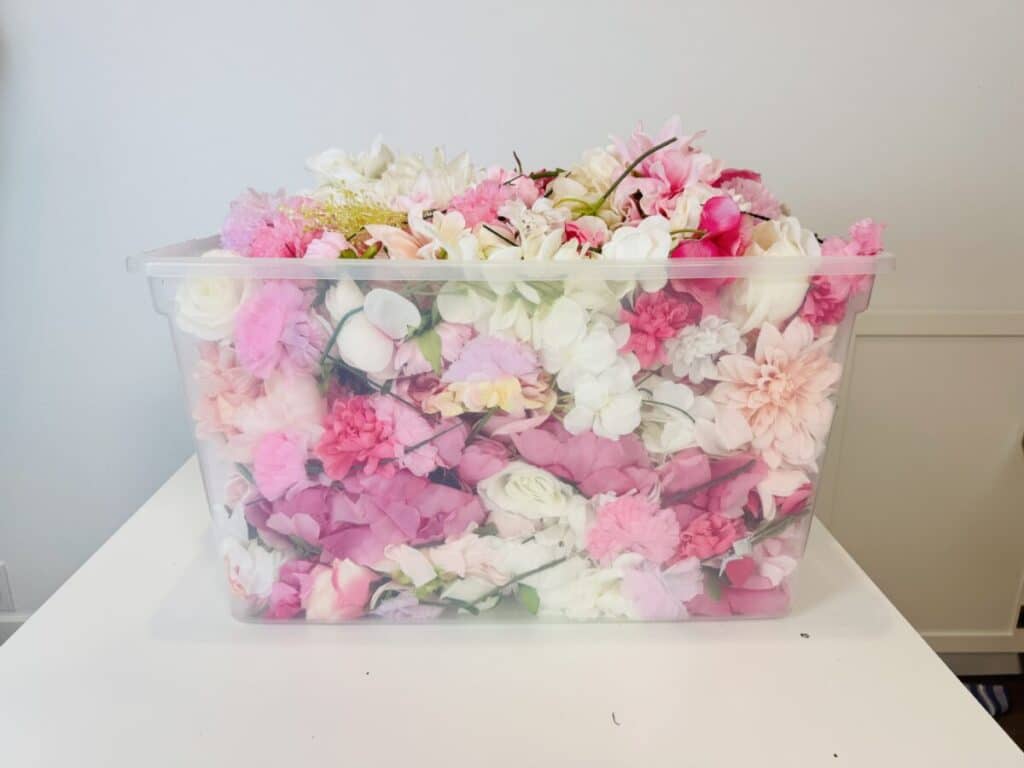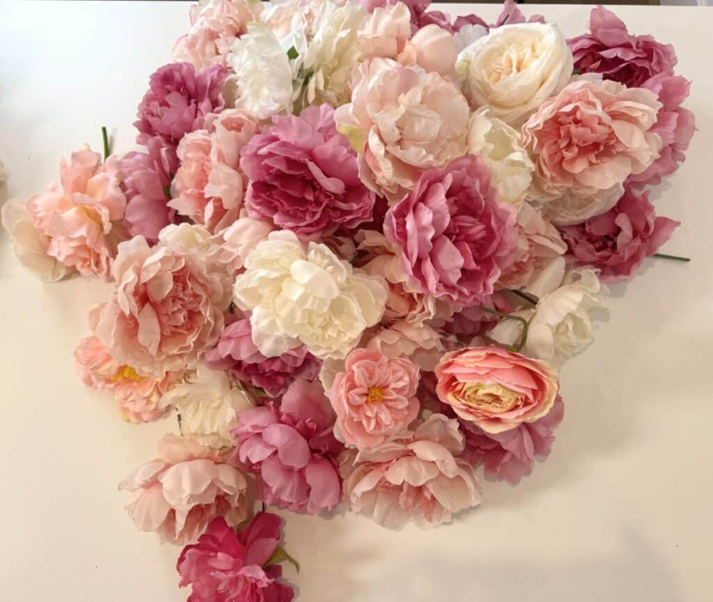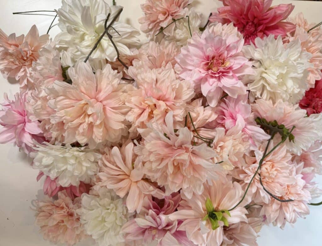 I used a mix of white and pink peonies, dahlias, roses, carnations, hydrangea, wisteria and small filler blooms — 315 stems in total. The variety of flowers and sizes gives it depth and stops it from looking flat. These were sourced primarily from Michaels using the Ashland range, with additional carnations and dahlias from Amazon.