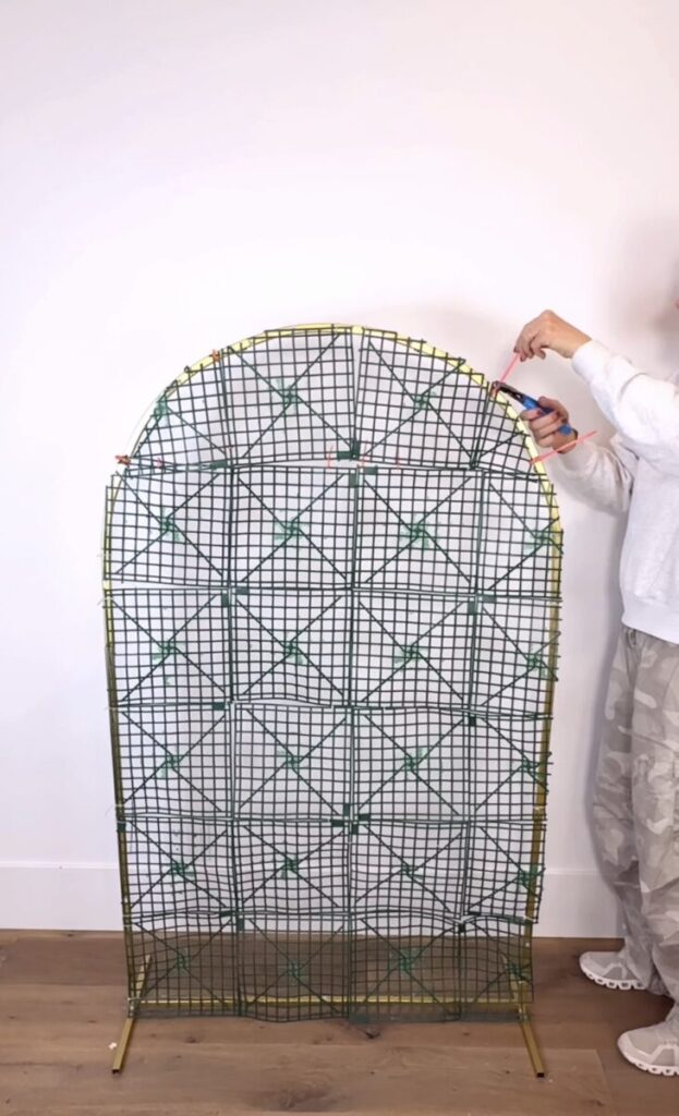 Start at the bottom. Connect 4 panels together (use zip ties if you have any issues with the connectors). Pull the four panels across the base of the arch and secure onto the frame with zip ties — one at each corner and one in the middle if the panels feel loose. Work your way up row by row. The straight panels will go on easily. When you reach the curved top of the arch you’ll need to cut a few panels to follow the curve of the frame. Measure the panel against the arch, mark where it needs to be trimmed, and cut. It doesn’t need to be perfect — the florals will cover every edge entirely once you’re done.