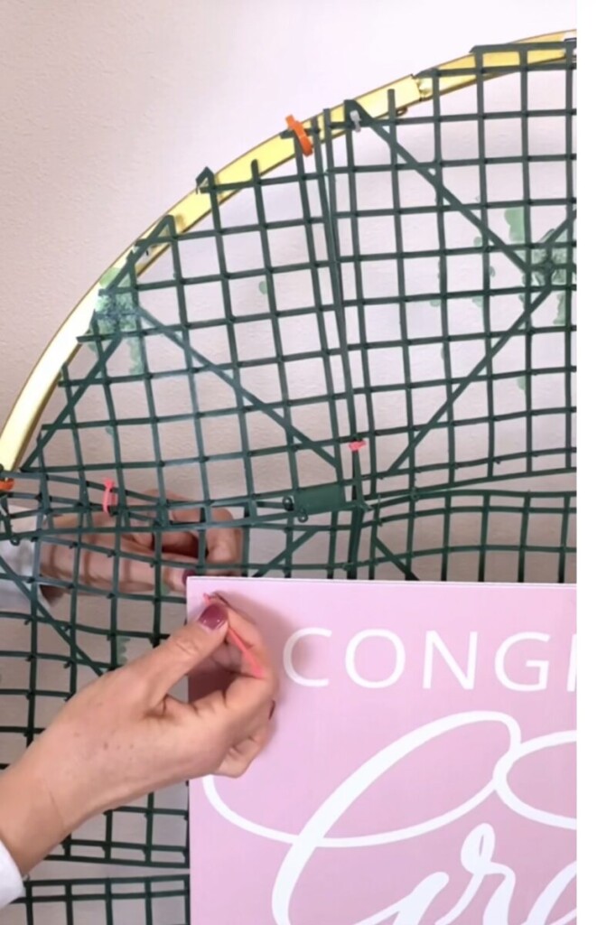 Hold your graduation lawn sign against the grid to find your position — I went dead centre, roughly one third of the way up the arch. Punch holes in each corner of the sign using a hole punch or skewer. Thread a zip tie through each hole and attach directly to the grid panel behind it. Trim the excess zip tie tails and you’re ready for the fun part.
