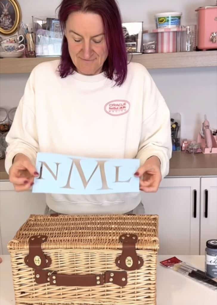 I spotted a plain rattan picnic basket at Michaels and immediately had an idea for personalizing it. A Cricut-cut cardstock monogram stencil, a little chalk paint, and about 20 minutes later I had a personalized monogrammed basket that honestly looks like it came from a boutique gift shop. The kind of thing you’d pay a lot of money for online. We’re making it ourselves — and it’s so much easier than it looks.