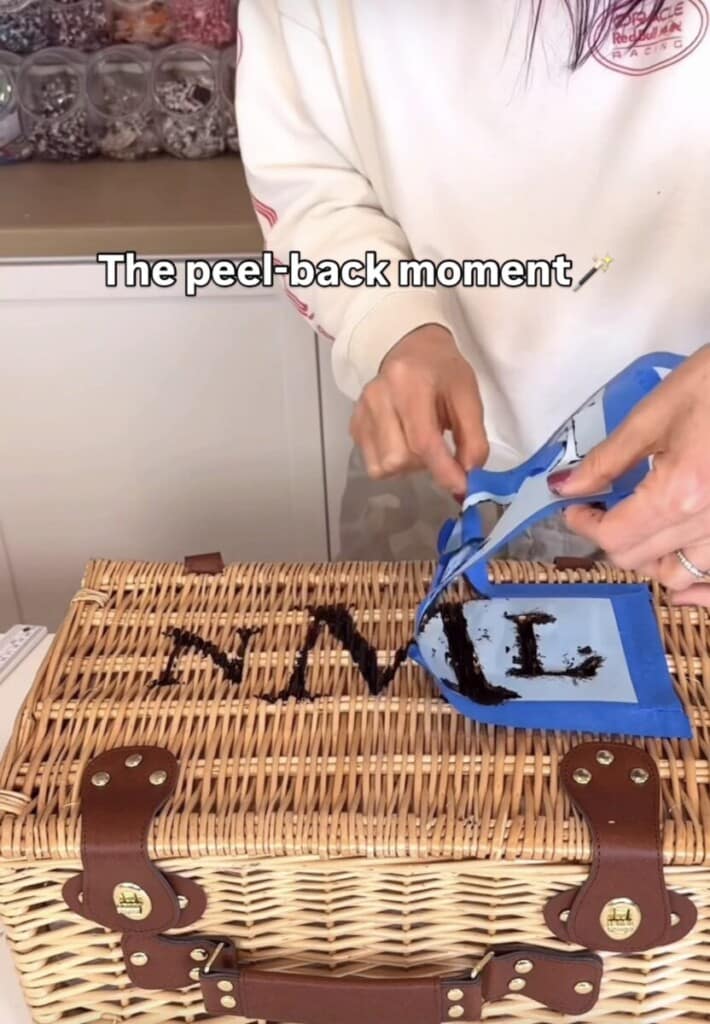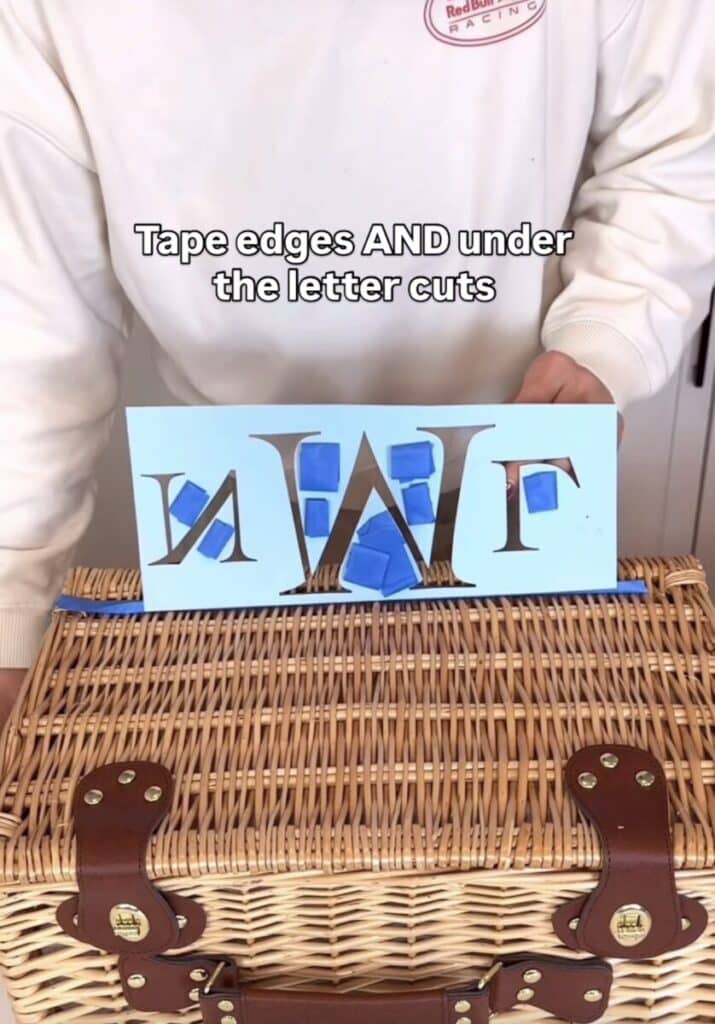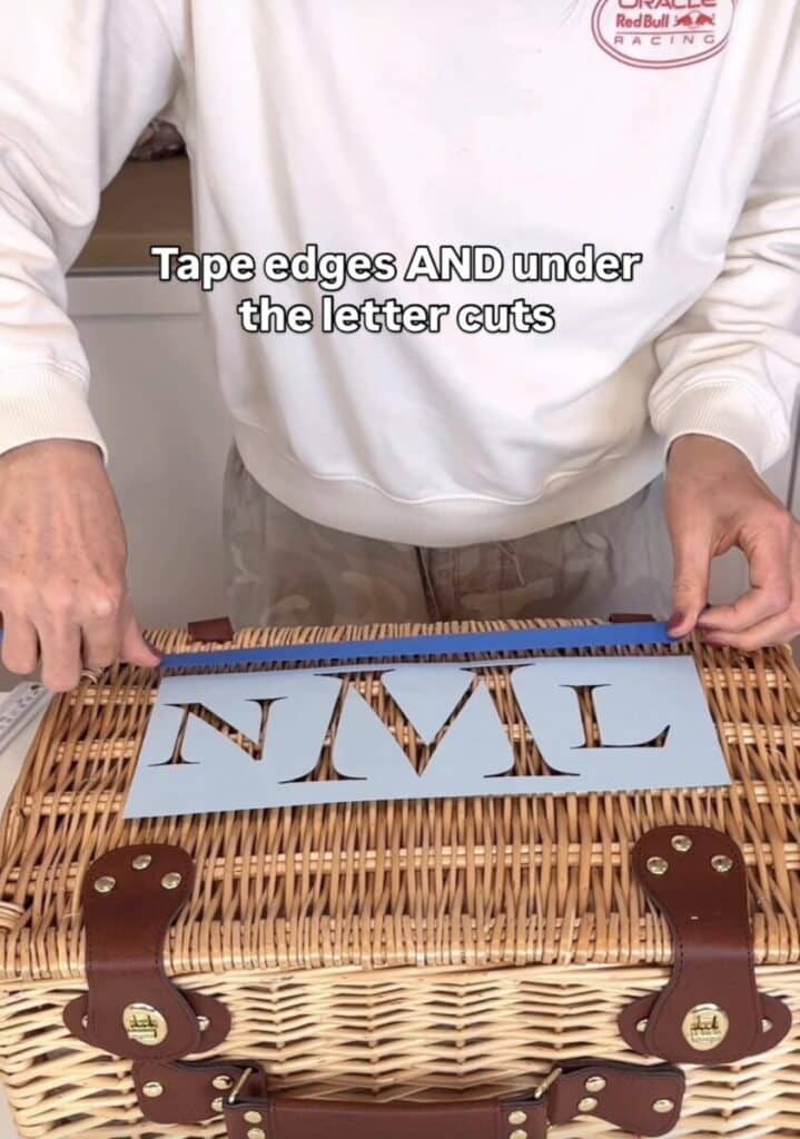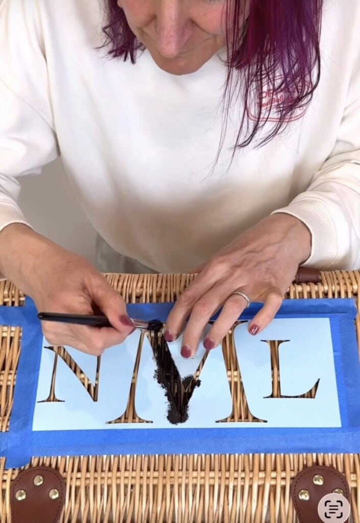 How do I get clean edges when stencilling on rattan? The key is double-sided tape underneath interior letter cuts, plus pressing down firmly on the stencil as you paint. Use a stippling motion with your stencil brush rather than brushing side to side, and work in light layers rather than one heavy coat.