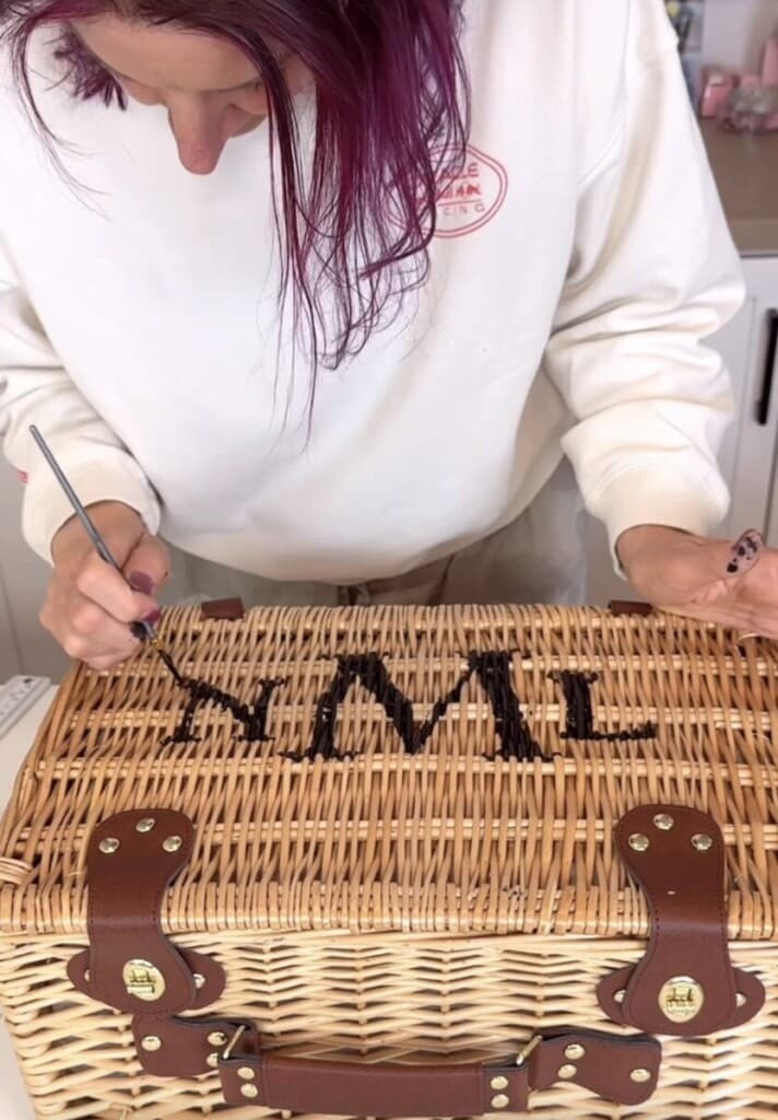 Once the stencil is off, use your fine detail brush to clean up any edges that need a little attention. The natural texture of rattan creates some variation — a small amount of this actually looks beautiful and gives the monogram character. You’re just tidying the obvious areas.