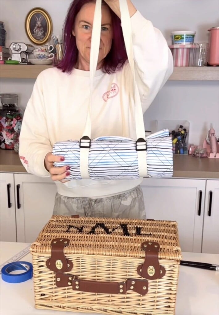 What do you put in a picnic basket gift? For this Mother’s Day picnic basket I went with bubbly, napkins, insulated glasses, a picnic blanket, and faux florals — all from Michaels. But it’s completely customizable. Think about what the recipient loves: tea and shortbread, spa products, a coffee kit, wine and cheese accessories, or a book and candle. The monogrammed basket is the star — what goes inside is a bonus.