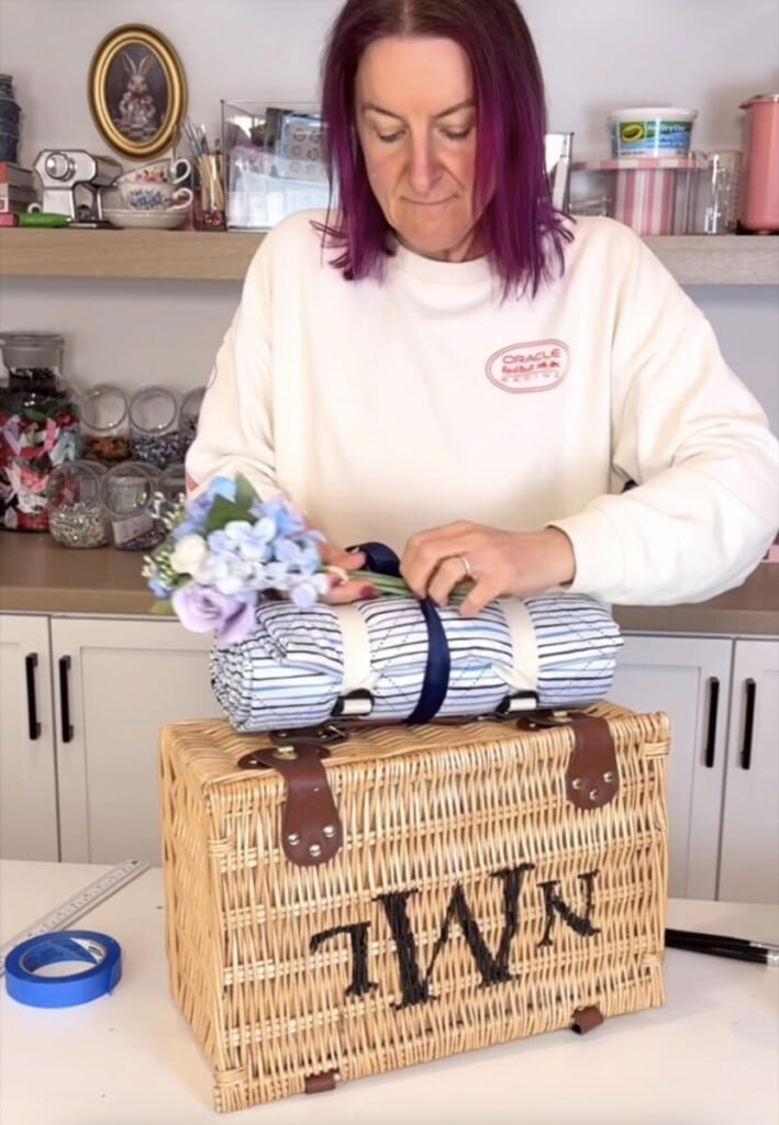 I styled the finished basket outside and it looked even better than I imagined. The black monogram against the natural rattan, the navy and coastal blue linens, the purple florals — it all came together into something that feels genuinely special and completely personal.