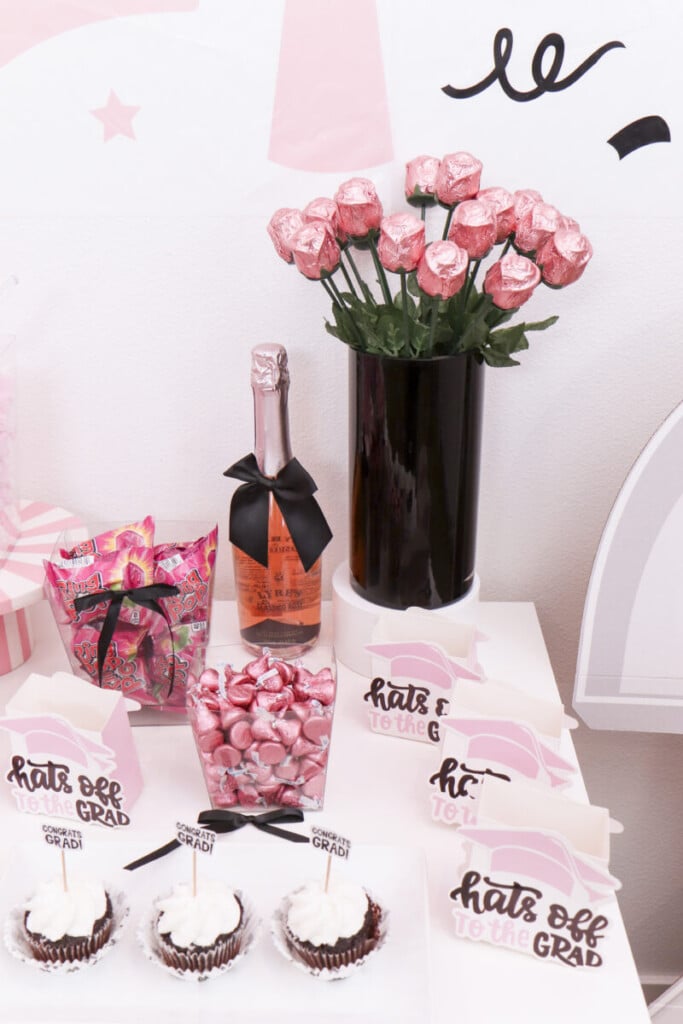 The black vase of pink chocolate roses on the right side of the table was the most unexpected element of this whole candy bar — and the one every guest commented on first. Additionally, it doubled as a gift the grad could enjoy after the party. Place the roses one by one, fanning them out to get more width. The contrast of pink against the black vase is striking.