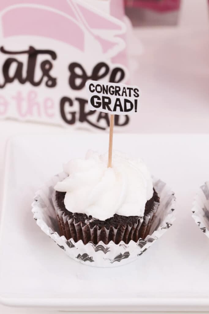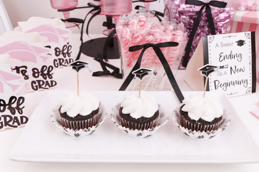 Chocolate cupcakes in graduate themed wrappers with Congrats Grad toppers sit on white plates on either side of the center. The white plates keep the look clean and let the grad elements on the wrappers and toppers stand out.