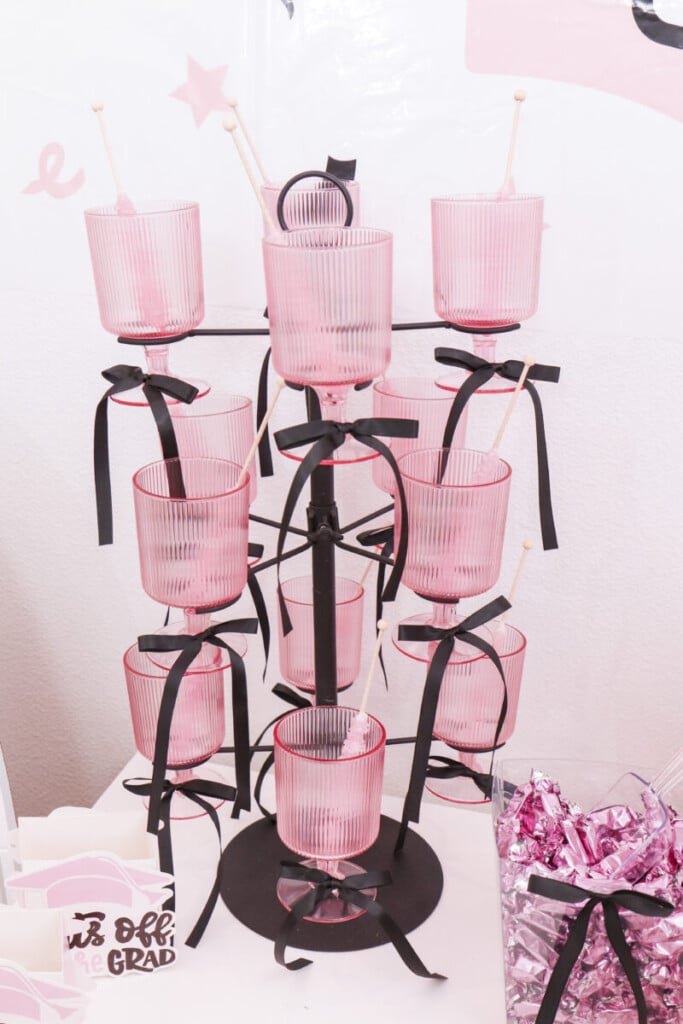 On the left, the black glass tower holding pink ribbed glasses — each one tied with a black bow and containing a pink rock candy stick — this was the element that made people stop and ask where I found it. The girls loved the rock candy stirrers too! Place the glasses onto the stand before adding the candy sticks.