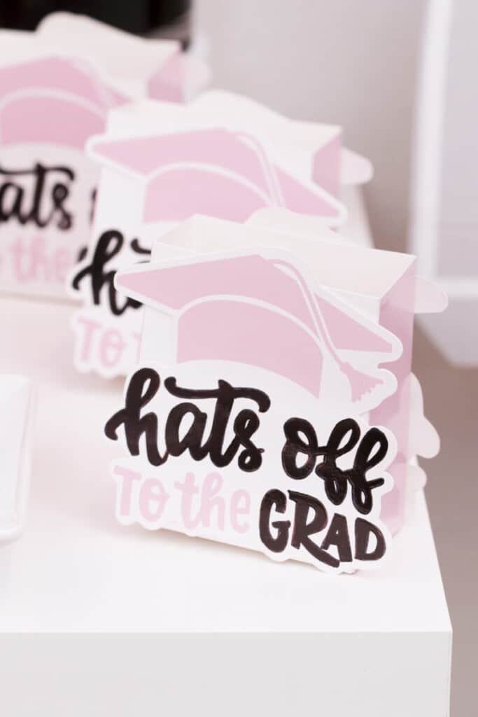 The “Hats Off to the Grad” favor boxes sit on either end of the front of the table, framing the table on each side. Additionally they serve a practical purpose — guests can fill them with candy to take home, which keeps the table looking tidy as the party progresses.