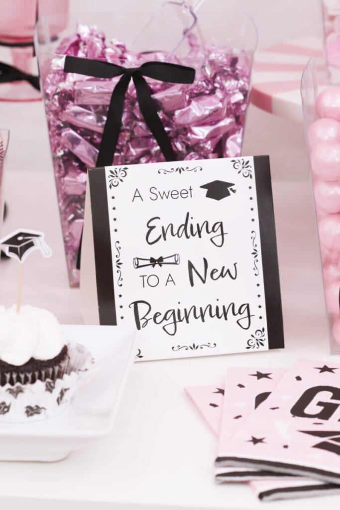 The “A Sweet Ending to a New Beginning” sign sits front and center between the two cupcake plates. It’s the emotional anchor of the whole table — every guest who reads it feels the occasion. Place it slightly angled rather than flat against the table so it’s readable from a standing position.